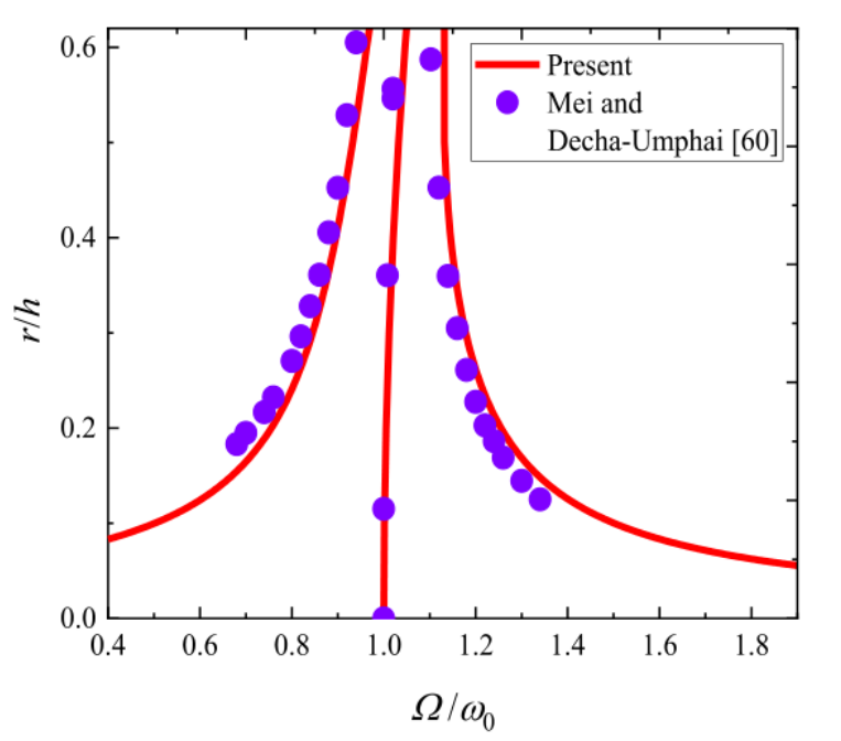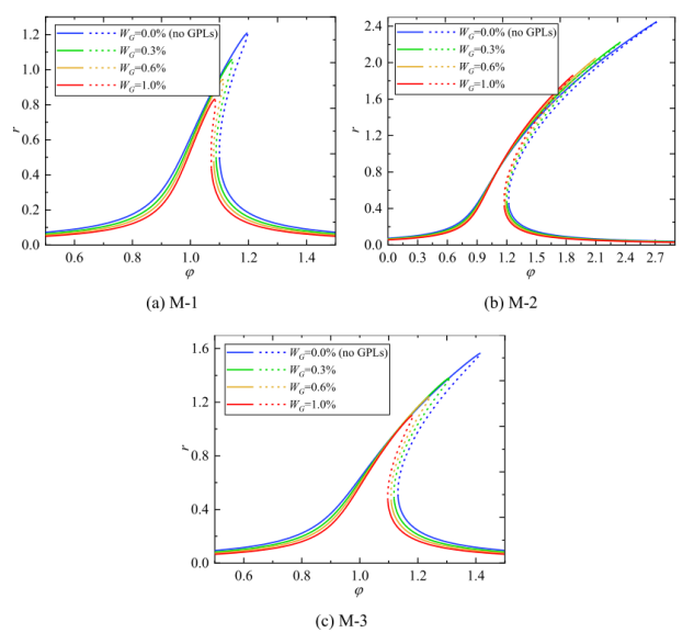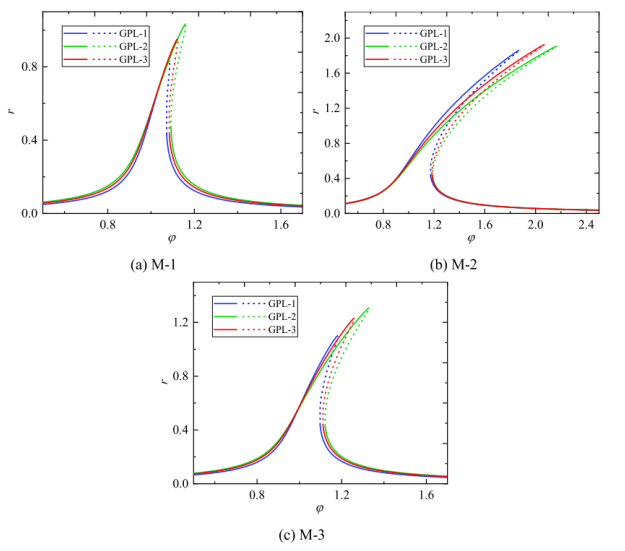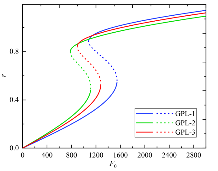 研究了石墨烯板增強泡沫金屬(GPLRMF)矩形板的非線性強迫振動。人們對這種新型納米復合材料結構的主、超諧波和次諧波共振進行了研究。考慮了三種石墨烯片(GPL)模式和三種孔隙度分布。基于von Kármán非線性板理論,通過Hamilton原理得到了GPLRMF板的控制方程和一般邊界條件。通過引入應力函數,用伽遼金法得到了板的非線性常微分方程。然后,采用多尺度法求解了GPLRMF板的頻率響應和力響應關系;并進行效度研究以驗證本方法的有效性。結果表明,GPLRMF板在主共振和超諧共振中表現出硬化非線性。在主共振和超諧共振中,在中間表面分散更多的小孔隙或更多的GPLs將導致板的振幅和共振域更大。而均勻分布的孔隙或均勻分布的GPLs在次諧波的情況下會導致較大的振幅。此外,孔隙率系數或GPL質量分數的變化可以顯著改變GPLRMF板的非線性動力學行為。