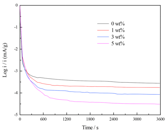 圖7. LaY2Ni9.5Mn0.5Al0.5+ x wt. %石墨烯電極的陽極電流-時間響應(yīng)。