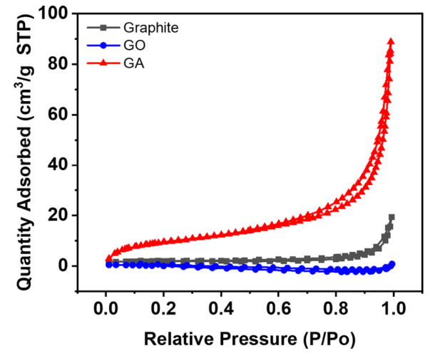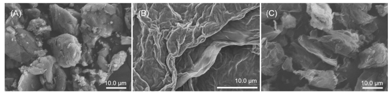圖2. (a)石墨、(b)GO、(c)GA的SEM圖像。