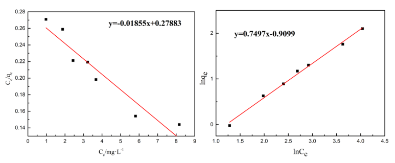 圖10. (a)Langmuir方程的擬合曲線(b) Freundlich方程擬合曲線。