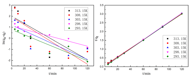圖11. (a)準一階動力學方程擬合曲線; (b)準二階動力學方程擬合曲線。