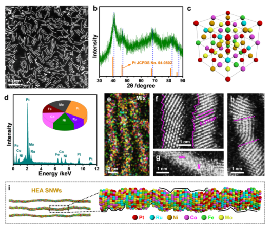 Figure 1. HEA SNWs 的表征。a HAADF-STEM 圖。b XRD圖。c 晶體結構。d SEM-EDS 和不同元素的原子比。e HAADF-STEM-EDS 元素映射。f-h 球差校正的HRSTEM圖。i 3D模型和HEA SNWs的放大原子模型。