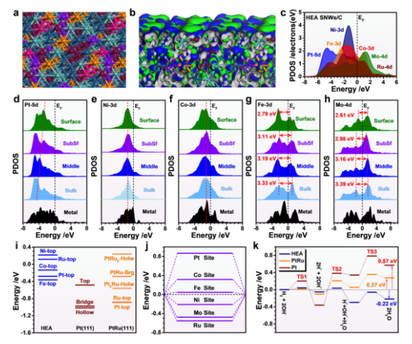 Figure 4. HEA SNWs上HOR 路徑的DFT計算。a優化的幾何結構頂視圖。b 費米能級附近電子分布的3D等高線圖。c PDOS。d-h PDOS。i 不同位點上的HBE比較。j HEA SNWs/C中不同位點上的OH結合能。k 在HEA SNWs/C、Pt (111) 和PtRu (111)上的HOR能量趨勢。