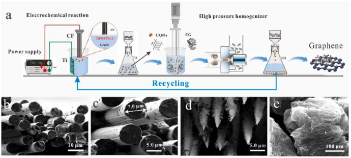 圖1. (a) CQDs和石墨烯制備工藝流程圖;(b)電解前CF束的SEM圖像;(c)電解前CF的SEM圖像;(d)電解后CF的SEM圖像;(e) EG的SEM圖像。