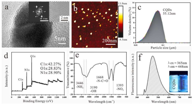 圖2. CQDs的(a)HR-TEM和SEAD圖像;(b) AFM圖像;(c)尺寸分布;(d) XPS圖譜;(e)FTIR譜;(f)熒光光譜。