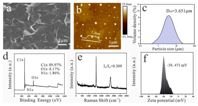 圖3. 石墨烯的(a) SEM圖像;(b) AFM圖像;(c)尺寸分布;(d) XPS譜;(e)拉曼光譜;(f)電動電勢。