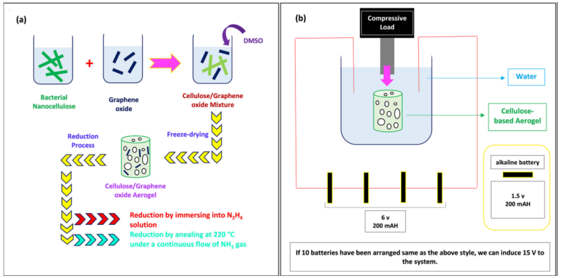 圖1. (a)氣凝膠的制備方法,(b)形狀記憶性能的測量裝置。