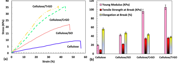 本文制備了一種含有氧化石墨烯(GO)、化學還原氧化石墨烯(CrGO)和熱還原氧化石墨烯(TrGO)的纖維素氣凝膠,用于研究其力學、電學性能和細觀(納米)結構特征。通過FT-IR光譜和EDS分析跟蹤了還原過程對纖維素/GO氣凝膠的影響,證實了還原過程的完成——碳/氧(C/O)比值顯然說明了這一點。利用SEM顯微照片研究了多孔結構的形成,汞-孔隙度測量法和BET測試結果顯示了氣凝膠的細觀(納米)結構。隨著楊氏模量的增加,碳氧比的提高,其力學性能得到了改善。研究了不同導電填料的加入對還原氣凝膠的低導熱性和中等導電性的影響。通過引入一種研究形狀記憶特性的新方法,在水環境中同時施加機械力和電場(不同電壓),獲得了熱還原氣凝膠最佳的形狀恢復速率。