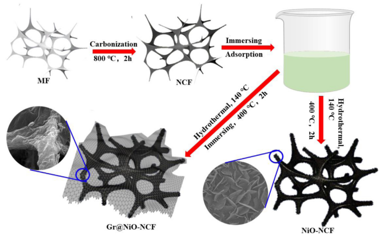 圖1. NCF、NiO-NCF和rGO@NiO-NCF的合成工藝示意圖。