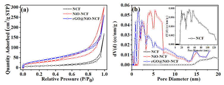 圖4. (a)氮吸附等值線和(b) NCF、NiO-NCF和rGO@NiO-NCF的QSDFT孔徑分布。