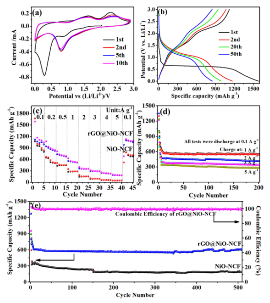 圖5. rGO@NiO-NCF的(a)CV曲線和(b)恒流充放電曲線,(c)在不同電流密度時NiO-NCF和rGO@NiO-NCF的倍率性能。(d)rGO@NiO-NCF在不同電流密度時的快速充電和慢放電性能,(e)rGO@NiO -NCF在1A g