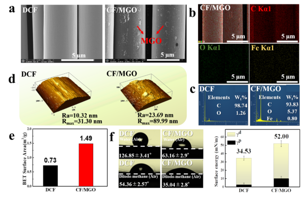 圖3. (a) DCF和CF/MGO的SEM圖像;(b) CF/MGO的映射圖像;(c) DCF和CF/MGO的EDS圖;(d) DCF和CF/MGO的AFM圖像;(e) DCF和CF/MGO的BET比表面積;(f) DCF和CF/MGO的表面能。