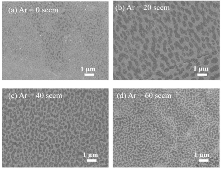 圖2. 不同Ar流量下用PECVD法在銅表面的石墨烯生長成核。(a)無Ar,(b) 20 sccm Ar, (c) 40 sccn Ar和(d) 60 sccm。其他生長條件如下: 1.9 V時銅經電化學拋光預處理5分鐘,生長溫度為850℃, 壓力為46 Pa,等離子體功率為50 W, CH