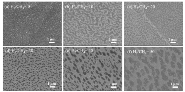 2流量下用PECVD法的石墨烯在銅表面的成核。(a) 0 sccm,(b) 2 sccm,(c) 4 sccm,(d) 6 sccm,(e) 8 sccm及(f)10 sccm。其他生長條件為: 1.9 V時銅經電化學拋光預處理5分鐘、生長溫度850℃、壓力為46 Pa、等離子體功率為50 W、CH