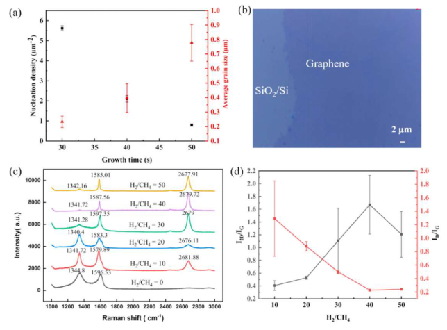 2等離子體的影響,成核密度明顯降低,晶粒尺寸增大。此外,我們通過測量活化能,研究了不同壓力下石墨烯的成核密度、晶粒尺寸和生長速率的能量,證明了低壓力、高生長溫度可以生長出低形核、大晶粒尺寸的石墨烯。