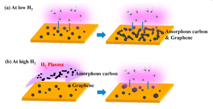 等離子體增強化學氣相沉積法(PECVD)由于其生長溫度低、節(jié)能和原位生長等優(yōu)點,成為一種極具潛力的工業(yè)合成石墨烯的方法。與傳統(tǒng)的熱化學氣相沉積(TCVD)不同,PECVD通常利用等離子體對烴類前驅體解離的促進石墨烯快速成核長大,導致石墨烯的成核密度顯著提高,晶粒尺寸變小,降低了其電性能。了解和控制PECVD過程中石墨烯的成核和生長對制備高質量石墨烯具有重要意義。在本研究中,我們注意到石墨烯的成核密度和晶粒尺寸受到各種大氣條件的顯著影響,包括Ar流量、H