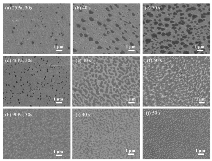 圖7. 在PECVD過程中,在不同壓力和不同生長時間下,石墨烯在銅表面的成核和生長。(a)~(c)25 Pa, (d)~(f) 46 Pa, (h)~(j) 90 Pa。其他生長條件為: 1.9 V時銅經電化學拋光預處理5分鐘、生長溫度850℃、等離子體功率為50 W、H