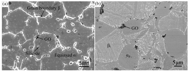 圖1. (a)GO/Ti-HIP和(b)復合材料在1075°C時固溶處理后的 SEM 圖像。