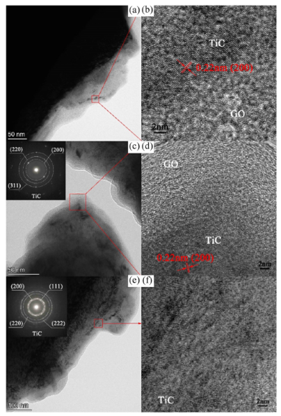 圖3. (a,b)GO/Ti-1025 HT中GO的TEM圖像和(c,d)GO/Ti-1050 HT、(e,f)GO/Ti-1075 HT中GO的TEM圖像和SAED圖案。