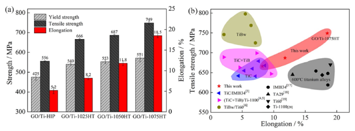相關研究成果由清華大學摩擦學國家重點實驗室Hang Chen等人于2022年發表在Composites Communications (https://doi.org/10.1016/j.coco.2022.101077)上。原文:Excellent high-temperature strength and ductility of graphene oxide reinforced high-temperature titanium alloy matrix composite fabricated by hot isostatic pressing and heat treatment。