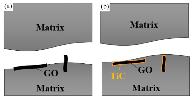 圖5. (a)GO/Ti-HIP和(b)GO/Ti-1075 HT的斷口示意圖。