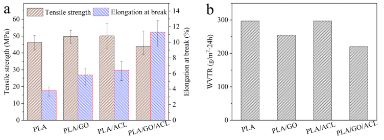 相關(guān)研究成果由南京林業(yè)大學(xué)化學(xué)工程學(xué)院,林產(chǎn)品高效加工利用協(xié)同創(chuàng)新中心Xiaobao Li等人于2022年發(fā)表在Materials Letters (https://doi.org/10.1016/j.matlet.2022.131829)上。原文:Synergistically enhanced toughness and water vapour barrier performance of polylactic acid by graphene oxide/acetylated lignin composite。
