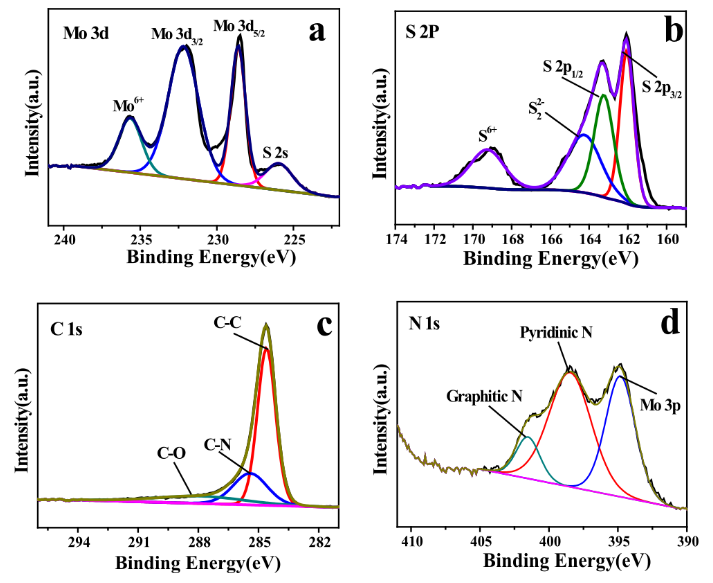 /GL-NCF-60樣品的XPS圖譜。(a) Mo 3d-S 2 s, (b) S 2p, (c) C 1 s, 和 (d) N 1 s-Mo 2p