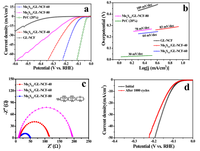 圖5. 樣品的HER電催化活性。(a)極化曲線,(b)Tafel圖,(c)EIS奈奎斯特圖,和(d)MoS