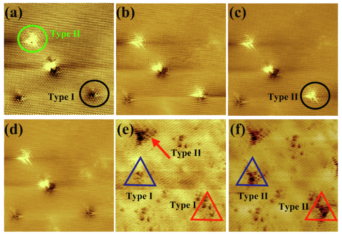 圖1. (a)-(d)循序拍攝的雙層外延石墨烯中缺陷的系列 STM 形貌圖像 (20 nm × 20 nm)。(e)-(f)循序拍攝的雙層外延石墨烯中缺陷的 AFM 形貌圖像(10 nm × 10 nm),顯示了特征轉換。