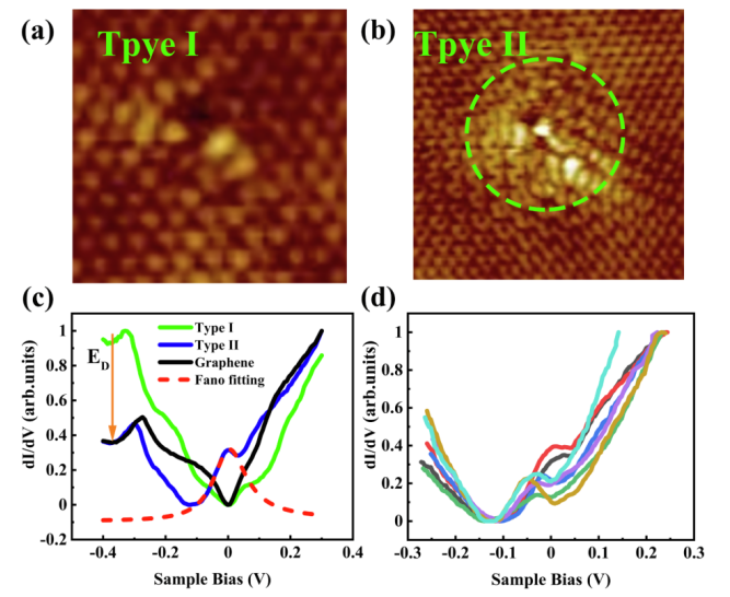 圖2. (a)I型(b)和II型缺陷的STM形貌圖像。 (c)從標記為I型和II的缺陷中獲得的連續隧穿微分電導譜。紅色虛線代表Fano擬合曲線。擬合參數為 q = -0.0753, Γ= 67.53 meV。(d)為II型缺陷記錄的七個隧道光譜。