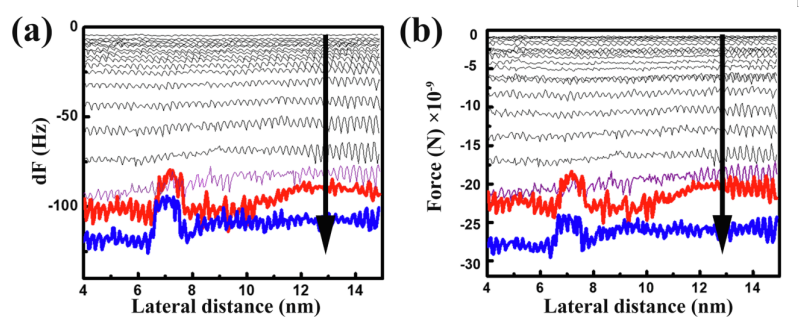 圖4. (a)頻移dF在某個位置上方恒定高度的記錄[如圖 1 (e)-(f) 中的藍色三角形標記]。 (b)從圖(a)的數據中提取的力。