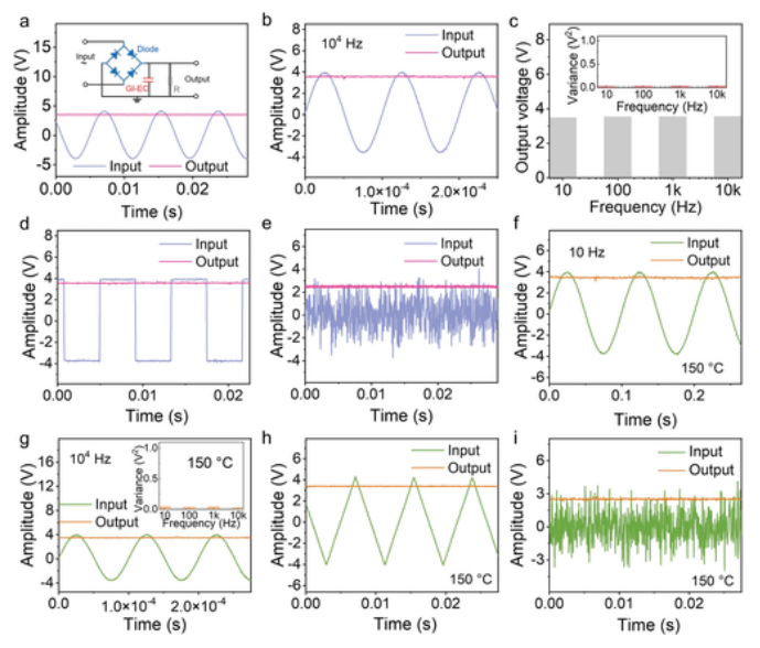 Hz 的交流信號;c) 輸出信號在不同頻率下的平均電壓,插圖為輸出信號在不同頻率下的方差;d,e) 輸入信號 (120 Hz) 分別為方波和強噪聲波。f-i) GI-EC 在 150℃ 下的濾波性能:f,g) 輸入信號分別為 10 Hz 和 10
