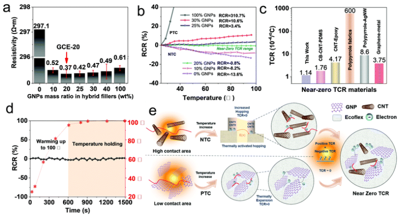 Figure 2. (a) GCE 纖維的電阻率作為混合 GNP/CNT 填料中 GNP 質量比的函數。(b) 當溫度從 25℃升高到 100℃時 GCE 纖維的 RCR。(c) 將制備的 GCE-20 纖維的 TCR 與以前的作品進行比較。(d) GCE-20 光纖的 RCR,當溫度從 25℃升高到 100℃并在 100℃下保持 15 分鐘時。(e) 示意圖顯示了具有接近零 TCR 的 GCE-20 光纖的機制。