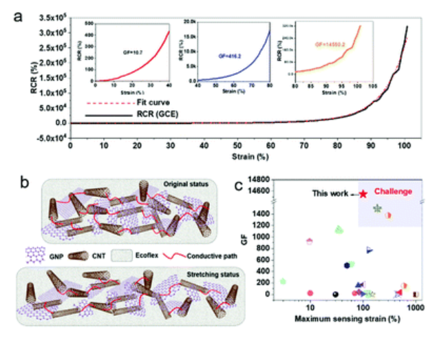Figure 3. (a) GCE 應變傳感器的 RCR 作為施加應變的函數。(b) GCE 應變傳感器的應變傳感機制。(c) GCE 應變傳感器的 GF 值和應變范圍與之前報道的那些工作的比較。