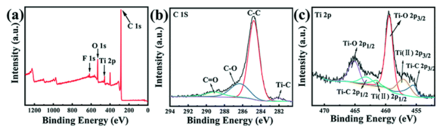 Figure 2. MGA6的XPS光譜:(a)總譜和(b)C 1s和(c)Ti 1s光譜。