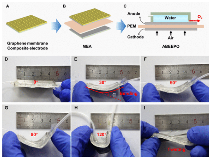 Figure 1. ABEEPO 制造過程和靈活性測試的示意圖。 (A) 柔性石墨烯膜復合電極。 (B) 膜電極組件 (MEA)。 (C) 純氧的空氣呼吸電化學提取 (ABEEPO)。 (D-H) 不同彎曲角度的彎曲測試。 (I)扭轉試驗。