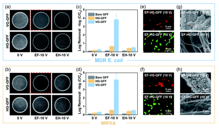 Figure 3. EF-VG-GFF 系統的凈化性能。 (a和b) MDR大腸桿菌 (a) 和MRSA (b) 在用不同方法純化后的濾液中的電鍍結果。 0 V 表示系統在沒有施加電壓的情況下運行,而 EF-10 V 和 EH-10 V 分別代表 EF 和 EH 消毒系統中 10 V 施加電壓的運行條件。 (c 和 d) (a 和 b) 中樣品的 MDR 大腸桿菌 (c) 和 MRSA (d) 的相應統計數據。 (e 和 f) 濾液中 MDR 大腸桿菌 (e) 和 MRSA (f) 的活/死熒光染色。 (g 和 h) MDR 大腸桿菌的代表性 SEM 圖像。 (g) 和 MRSA (h) 在過濾和消毒后的過濾器上。誤差棒代表從三個不同制備批次的三個重復計算的標準偏差(每個重復由同一批次的一對濾膜組成)。