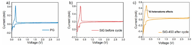 Figure 4. (a) PG 和 (b) 循環(huán)前的 SiG-450 和 (c) 循環(huán)后的 SiG-450 的 CV曲線,掃描速率為 0.1 mV s-1。