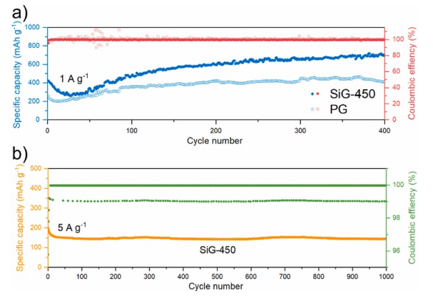 Figure 5. (a) SiG-450在1A/g下的循環(huán)性能 (b) SiG-450在5A/g下的循環(huán)性能。