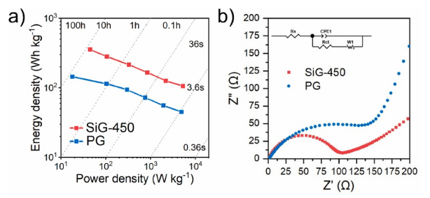 硅/碳復(fù)合材料被發(fā)現(xiàn)是一種防止電池循環(huán)過程中硅材料變質(zhì)的流行策略。在此,通過簡便的合成路線報(bào)道了一種新型的硅摻雜石墨烯材料(SiG),并研究了其在鋰離子電池中的應(yīng)用。微波輻照處理成功地實(shí)現(xiàn)了硅雜原子摻雜到石墨烯晶格中,從而使原始石墨烯的比容量增加了一倍。更重要的是,SiG 表現(xiàn)出循環(huán)后鋰離子存儲(chǔ)和擴(kuò)散的改善,以及能量密度和功率密度的提高,這歸因于分散在表面上的 Si 雜原子和更有序的石墨烯晶格。用 SiG/LiFePO4 組裝的全電池在 200 次循環(huán)后保持 86%。新穎的硅摻雜策略為高性能鋰離子電池的實(shí)際應(yīng)用鋪平了道路。