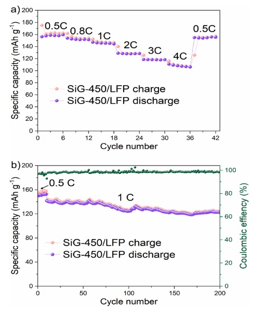 Figure 7. SiG-450/LFP全電池的倍率性能和循環(huán)性能。