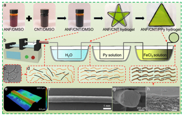 Figure 1. ANF/CNT/PPy氣凝膠纖維的制備:(a,b)制備流程示意圖; (c) ANF/CNT 分散體的 TEM 圖; (d) ANF/CNT 和 ANF/CNT/PPy 纖維的微流控組裝; (e) ANF/CNT/PPy 水凝膠纖維的 3D 圖; (f-h) ANF/CNT/PPy 氣凝膠纖維的 SEM 圖。