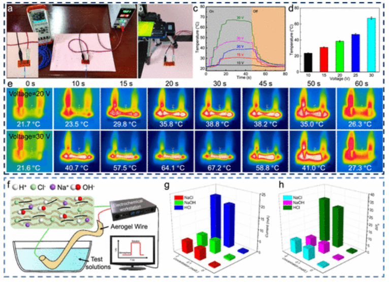 Figure 6. ANF/CNT/PPy 氣凝膠纖維的加熱性能和離子溶液識別:(a) 熱電偶測試裝置,(b) 熱像儀,(c) 溫度-時間曲線,(d) 溫度對電壓的響應; (e) 不同電壓下氣凝膠纖維的熱擴散圖像。 (f) 浸入 NaCl、NaOH 和 HCl 溶液中的 ANF/CNT/PPy 纖維; (g) i-t 曲線和 (h) 光纖中相應的相對電流變化。