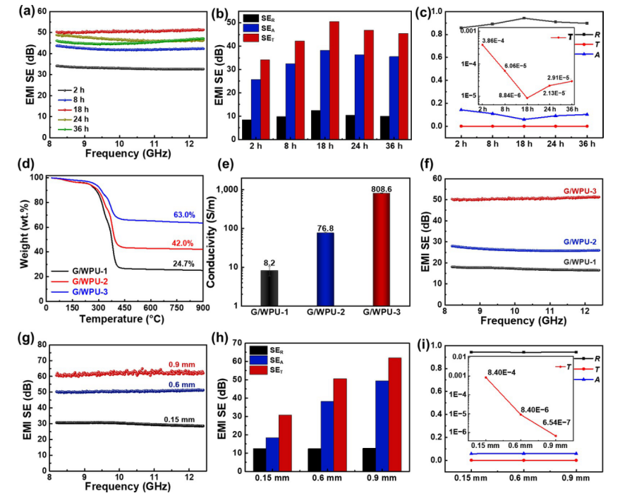 Figure 4. (a) 不同球磨時間制備的 G/WPU 薄膜在 X 波段頻率范圍內的 EMI 屏蔽性能。 (b) X 波段中平均 SE 吸收、SE 反射和 SE 總和的總結。 (c) G/WPU 薄膜的反射率 (R)、吸收率 (A) 和透射率 (T) 值的相應功率系數。 (d) 不同石墨烯含量的 G/WPU 薄膜的 TGA 曲線、(e) 電導率和 (f) EMI SE。 (g) 不同厚度的 G/WPU 薄膜的 EMI SE。 (h) 不同厚度的平均 SE 吸收、SE 反射和 SE 總和的總結。 (i) 不同厚度的 G/WPU 薄膜的 R、A 和 T 值的對應功率系數。