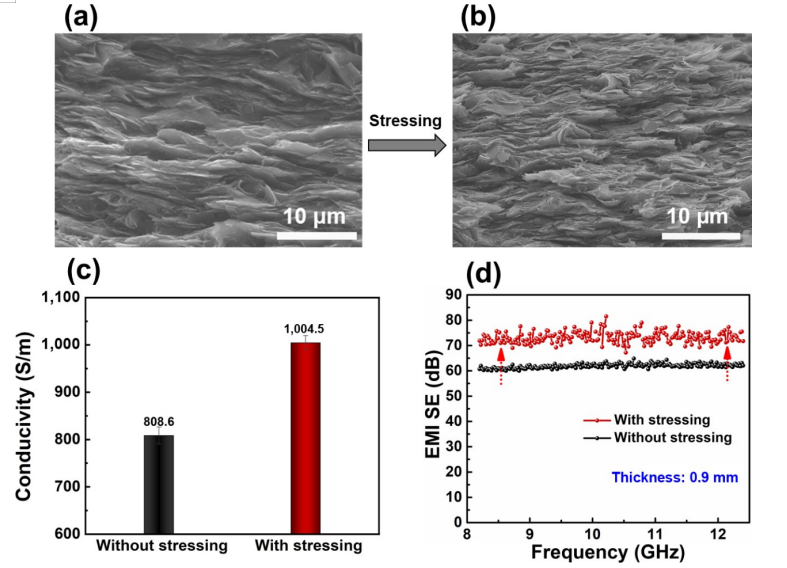 Figure 5. (a)未經熱壓處理和(b)經熱壓處理制備的 G/WPU 薄膜的橫截面圖。 (c) 采用和未采用應力工藝制備的 G/WPU 薄膜的電導率和 (d) EMI SE 性能。