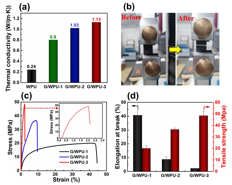 Figure 7. (a) 純WPU薄膜和不同石墨烯含量的G/WPU薄膜的熱導率。 (b) G/WPU 薄膜分別在拉伸和斷裂狀態下的照片。 (c)不同石墨烯含量的G/WPU薄膜的(c)拉伸應力-應變曲線和(d)拉伸強度和彈性模量,(c)中的插圖是G/WPU-3薄膜的曲線。