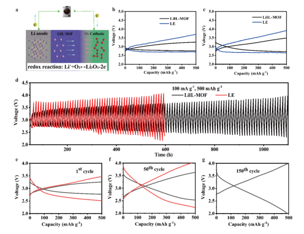 -1。 (e) LiIL-MOF和LE電池的電壓-容量曲線的第1次。 (f) 第50次和 (g) 第150次循環。