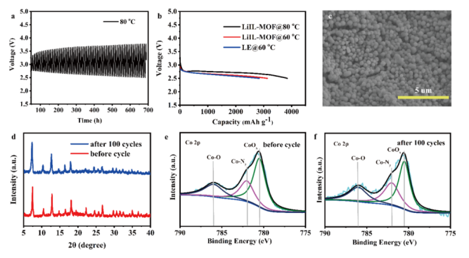2電池被認為是電動汽車的實用儲能裝置。而該研究的主要挑戰是由電解質和陰極的降解以及消耗電池壽命的鋰枝晶的形成引起的電極/電解質的界面不穩定性。同時,高溫會加速界面反應,導致電池快速死亡。在此,我們提出了一種基于金屬有機框架(MOF)和離子液體(IL)的多功能準固態電解質,以在高溫下同時穩定鋰離子電池的陰極并保護鋰陽極。電解質具有可忽略的揮發性和與電極的良好潤濕性,并且IL和MOF的協同效應通過形成均勻的Li