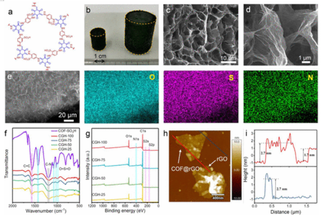 3H 的化學結構。 (b) 分別使用 20 mL(左)和 120 mL(右)高壓釜合成的 CGH-50 的照片。 (c, d) CGH-50 的 SEM 圖像。 (e) CGH-50 的 SEM 圖像和相應的 EDS 映射。 (f) COF-SO
