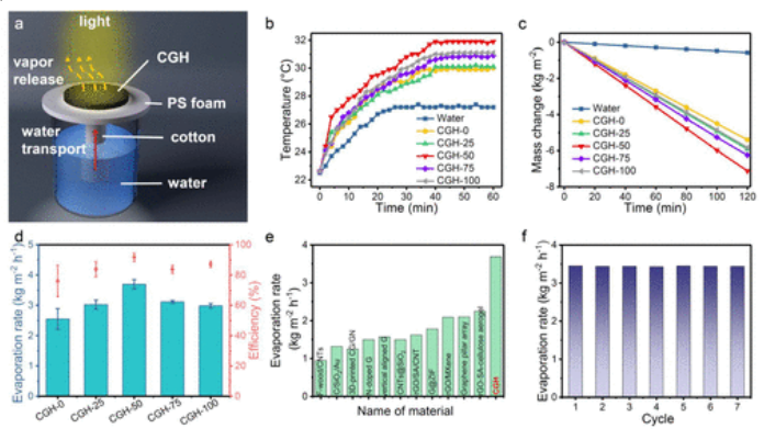 -2)下隨時間變化的溫度和質量變化。 (d) 來自 CGH 的水分蒸發率和 1 個太陽下的能源效率。誤差條代表使用不同樣品的五次測量獲得的標準偏差。 (e) 蒸發速率比較顯示 CGH-50 在碳基蒸發器中的高性能。 (f) 使用模擬海水和 CGH-50 進行七個循環的穩定性測試。